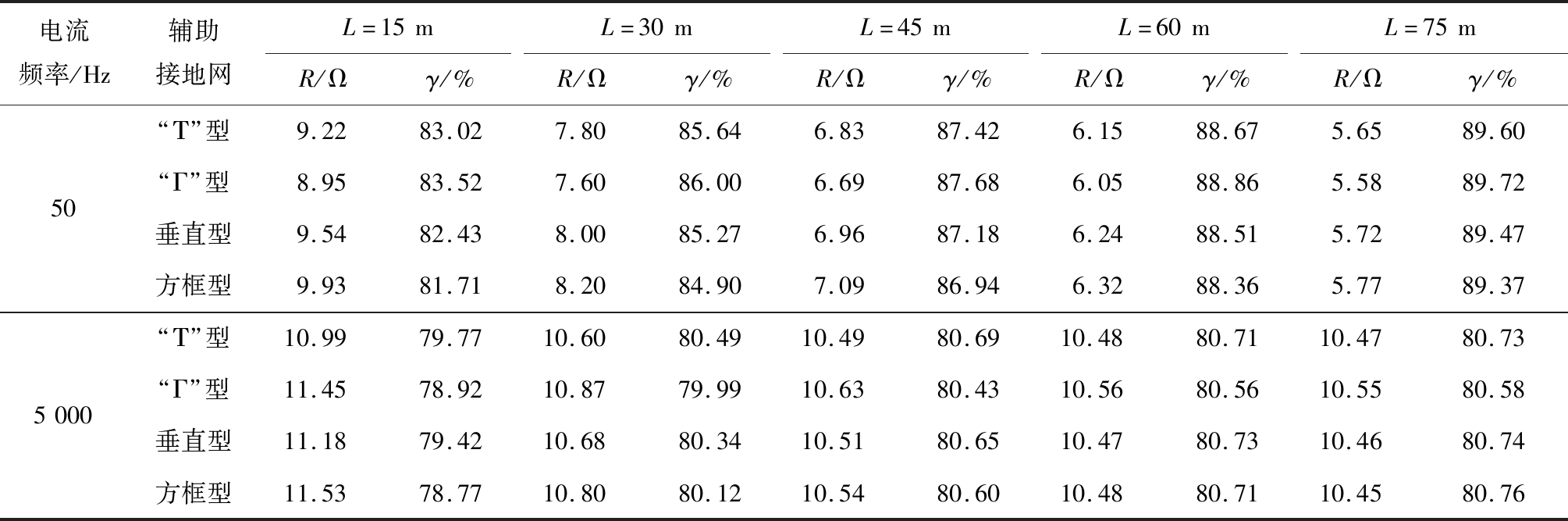 电流频率/Hz辅助接地网L=15mL=30mL=45mL=60mL=75mR/Ωγ/%R/Ωγ/%R/Ωγ/%R/Ωγ/%R/Ωγ/%505000“Τ”型9.2283.027.8085.646.8387.426.1588.675.6589.60“Γ”型8.9583.527.6086.006.6987.686.0588.865.5889.72垂直型9.5482.438.0085.276.9687.186.2488.515.7289.47方框型9.9381.718.2084.907.0986.946.3288.365.7789.37“Τ”型10.9979.7710.6080.4910.4980.6910.4880.7110.4780.73“Γ”型11.4578.9210.8779.9910.6380.4310.5680.5610.5580.58垂直型11.1879.4210.6880.3410.5180.6510.4780.7310.4680.74方框型11.5378.7710.8080.1210.5480.6010.4880.7110.4580.76