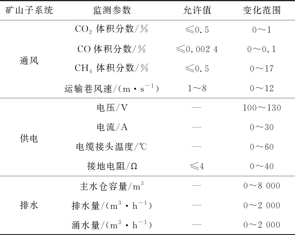 构建典型的矿山区域模拟系统,包含通风、供电、排水3个子系统。从3个子系统中选择11个监测参数,仿真时参数变化范围参考《煤矿安全规程》设置,见表1。