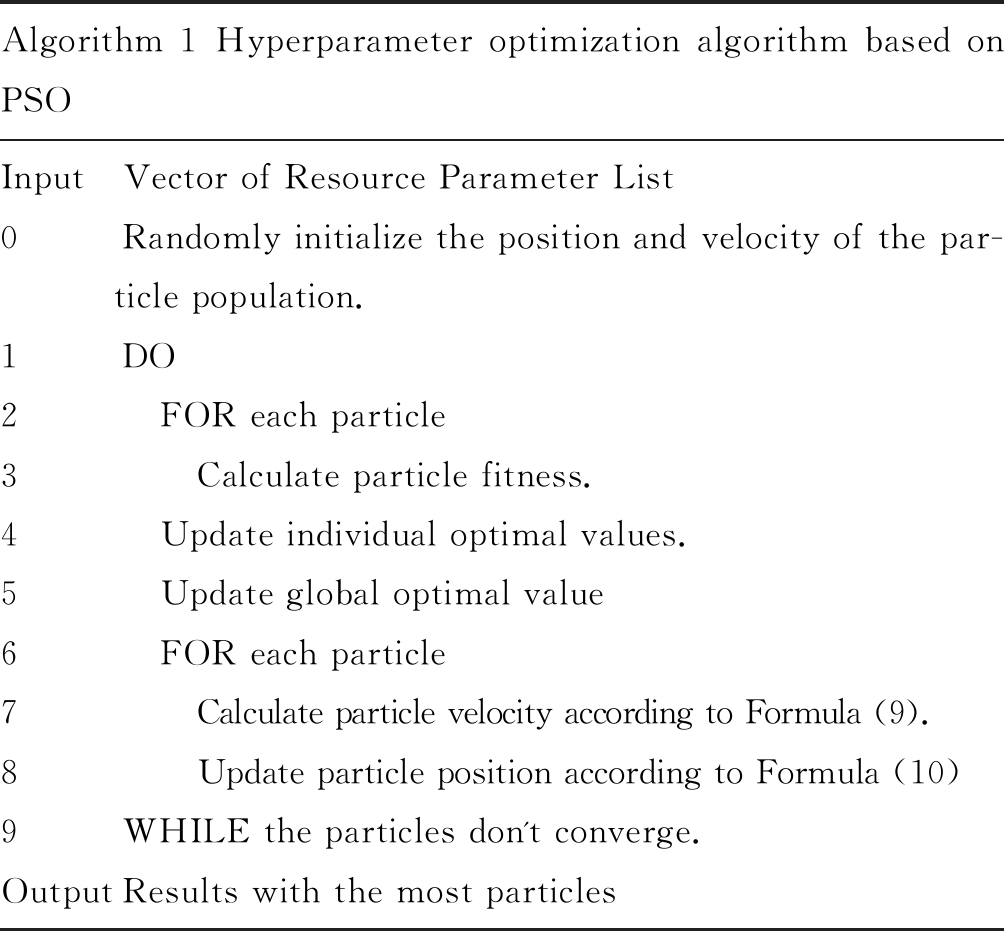 Algorithm 1 Hyperparameter optimization algorithm based on PSOInput Vector of Resource Parameter List0Randomly initialize the position and velocity of the par-ticle population.1DO2 FOR each particle3 Calculate particle fitness.4 Update individual optimal values.5 Update global optimal value6 FOR each particle7 Calculate particle velocity according to Formula (9).8 Update particle position according to Formula (10)9WHILE the particles don't converge.OutputResults with the most particles