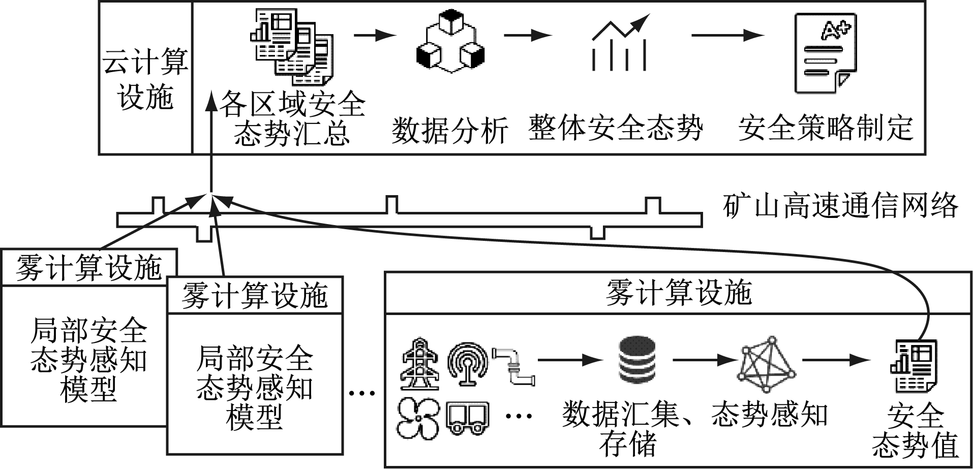 (1) 矿山多层级安全态势感知系统通过部署于雾计算设施中的局部安全态势感知模型汇集矿山区域范围内各子系统监测数据,感知矿山局部安全态势,并将局部安全态势数据上传至云计算设施。部署于云计算设施中的全局安全态势感知模型对汇集的各区域局部安全态势数据进行分析,感知整个矿山安全态势,进而制定安全策略。