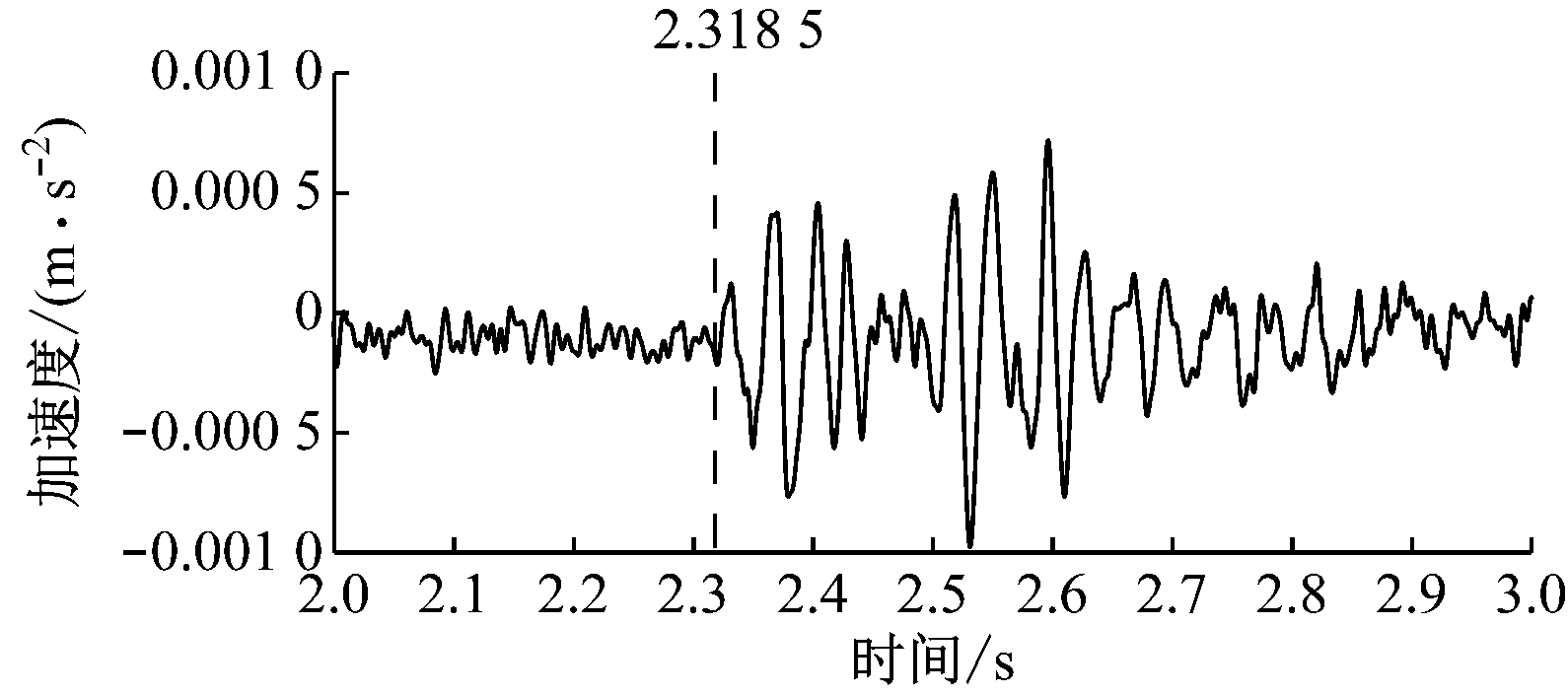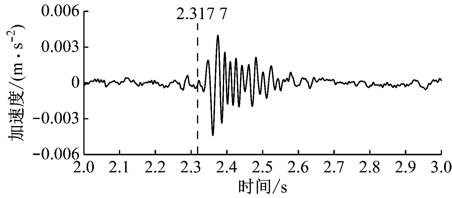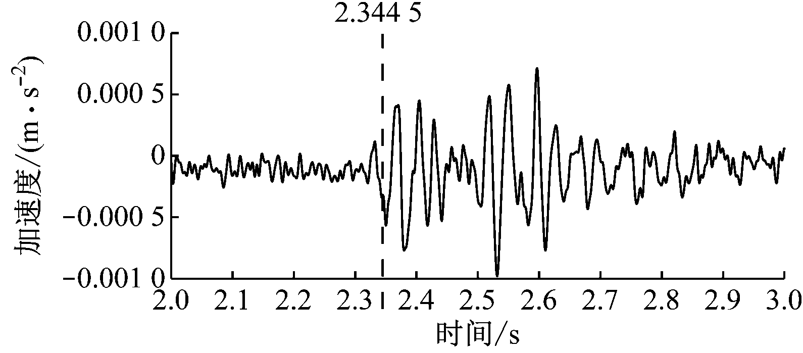 选取高信噪比微震数据S3和低信噪比微震数据S7作为测试数据。对S3拾取的微震初至波到时如图4所示。可看出人工拾取方法、本文方法、STA/LTA法拾取的微震初至波到时分别为2 334.6,2 330.0,2 317.7 ms。以人工拾取结果为标准,本文方法与STA/LTA法的拾取误差分别为4.6,16.9 ms。对S7拾取的微震初至波到时如图5所示。可看出人工拾取方法、本文方法、STA/LTA法拾取的微震初至波到时分别为2 318.5,2 335.0,2 344.5 ms,本文方法与STA/LTA法的拾取误差分别为16.5,26.0 ms。可见本文方法比STA/LTA法对微震初至波到时的拾取精度高。