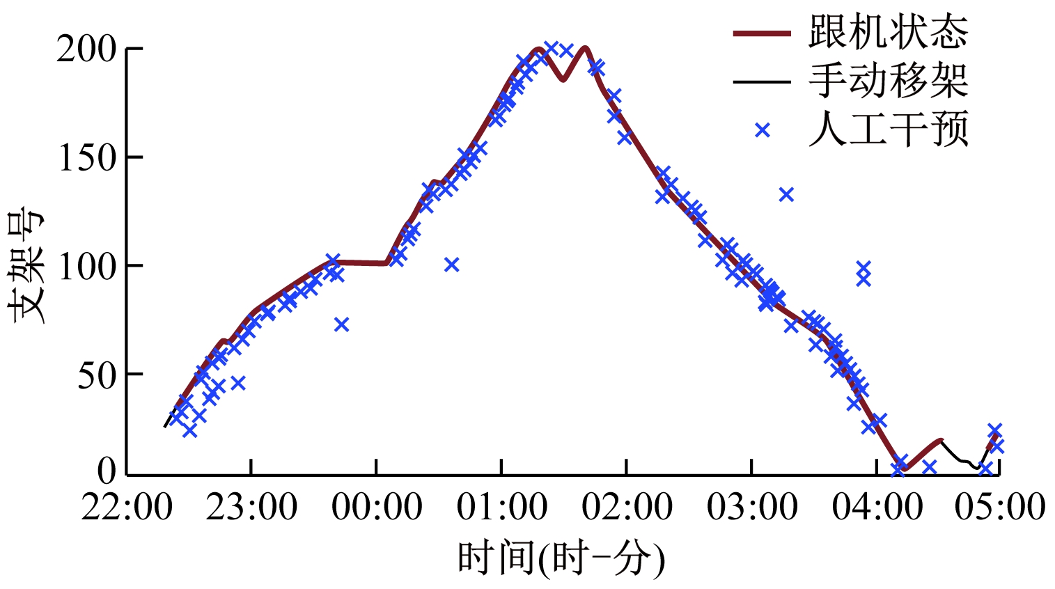 进一步分析发现,在采煤机运行速度较快时,推溜不到位的情况多发,且集中在中部支架,可据此调整中部支架的推溜控制逻辑。人工干预原因最多的是推/拉溜千斤顶不到位和直线度超差,分析发现,由于现场对工作面直线度要求较高,为了达到要求,人工干预推溜或移架操作,造成液压支架自动跟机状态的保护性解除,后续需要在这一方面完善现场控制与保护逻辑,避免过度安全保护操作。
