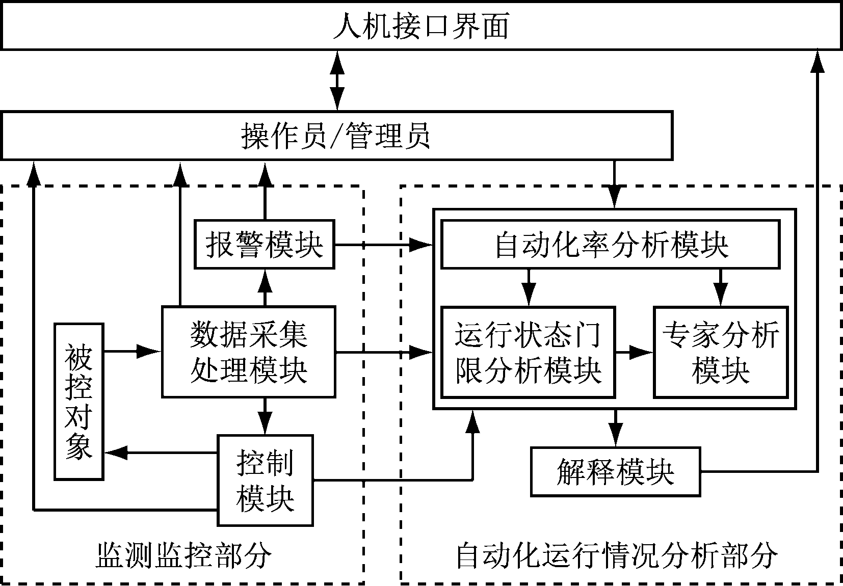 监测监控部分:数据采集处理模块是系统进行数据分析的基础。控制模块执行控制命令,记录人工干预行为。报警模块发出设备故障和自动化运行状态失效2类报警信息。
