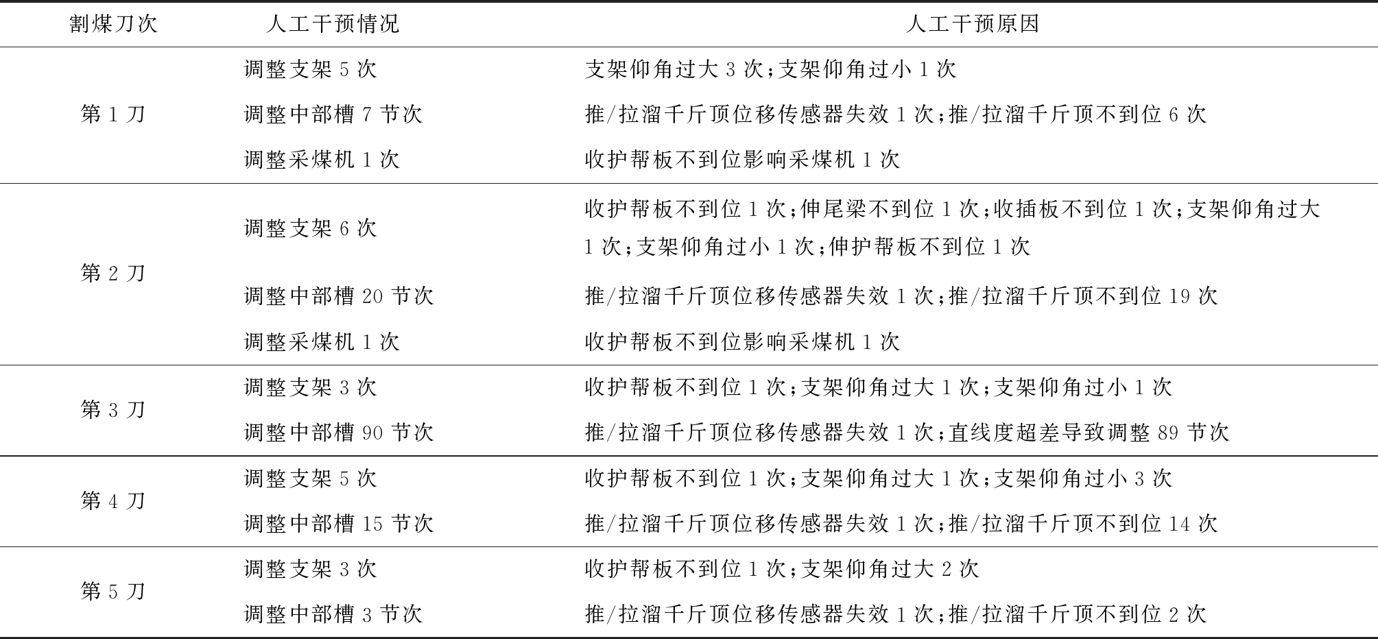 割煤刀次 人工干预情况人工干预原因第1刀调整支架5次支架仰角过大3次;支架仰角过小1次调整中部槽7节次推/拉溜千斤顶位移传感器失效1次;推/拉溜千斤顶不到位6次调整采煤机1次收护帮板不到位影响采煤机1次第2刀调整支架6次收护帮板不到位1次;伸尾梁不到位1次;收插板不到位1次;支架仰角过大1次;支架仰角过小1次;伸护帮板不到位1次调整中部槽20节次推/拉溜千斤顶位移传感器失效1次;推/拉溜千斤顶不到位19次调整采煤机1次收护帮板不到位影响采煤机1次第3刀调整支架3次收护帮板不到位1次;支架仰角过大1次;支架仰角过小1次调整中部槽90节次推/拉溜千斤顶位移传感器失效1次;直线度超差导致调整89节次第4刀调整支架5次收护帮板不到位1次;支架仰角过大1次;支架仰角过小3次调整中部槽15节次推/拉溜千斤顶位移传感器失效1次;推/拉溜千斤顶不到位14次第5刀调整支架3次收护帮板不到位1次;支架仰角过大2次调整中部槽3节次推/拉溜千斤顶位移传感器失效1次;推/拉溜千斤顶不到位2次