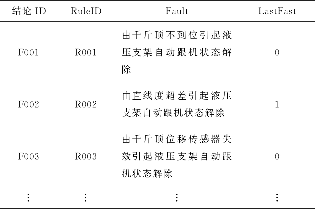 (3) 结论表(表3):存储规则的结论部分(THEN),按顺序排列。每个结论为1行,由结论ID、RuleID、结论描述(Fault)、最终结论标志(LastFast,0表示未匹配,1表示匹配)4个字段组成。例如,输出与条件所属规则号R002相匹配的结论描述中的内容:由直线度超差引起液压支架自动跟机状态解除。