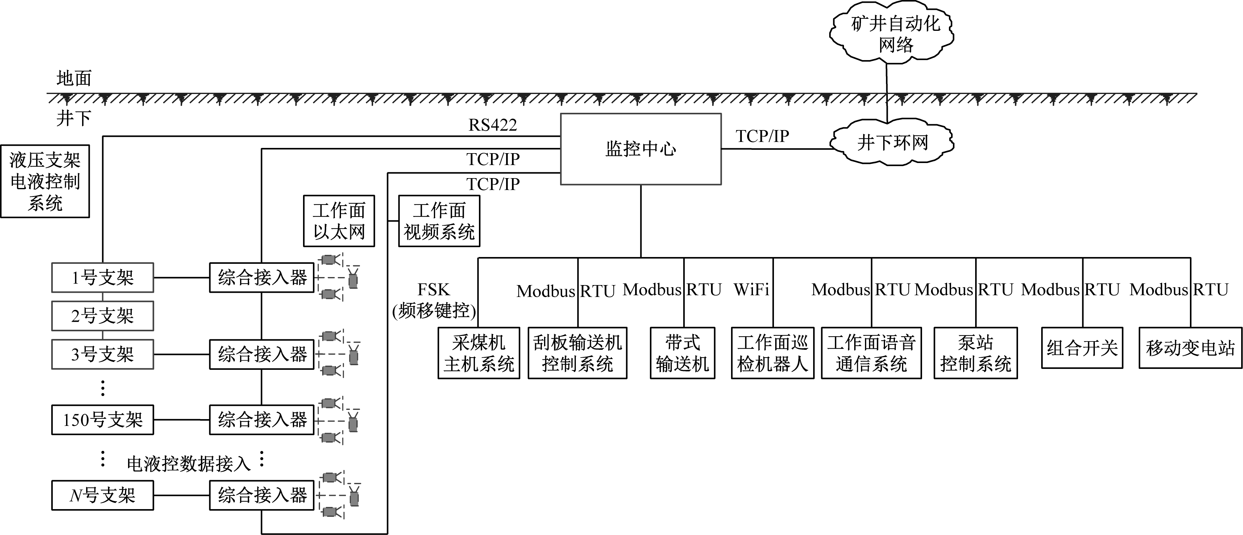 数据采集部分主要采集设备状态信息(如功率、油压、位移)、设备故障信息(如传感器故障)、设备耦合信息(如采煤机位置信息、直线度)、开关量信息(如设备启停信息)、生产信息(如采高、截深、采煤机速度、割煤刀数)。监控中心负责将采集到的信息进行汇总整理,结合远程人工干预控制情况进行统计分析后生成统计报表。数据传输部分即井下千兆工业以太网,由隔离耦合器、光电转换器、铠装电缆等构成。