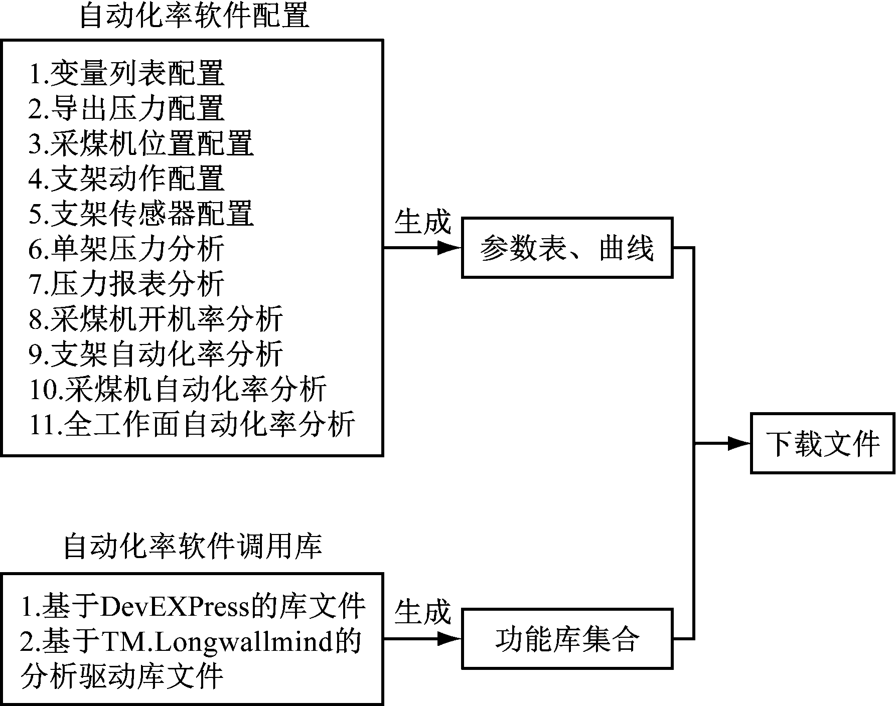 软件调用库中的相关库文件通过编译、链接后生成可执行的功能库集合,集合中包括液压支架自动跟机率检测模块、支架跟机干预率检测模块、放顶煤率检测模块、采煤机记忆割煤率检测模块、采煤机干预率检测模块、采煤机遥控器操作频率检测模块、放煤工作面控制系统开机率检测模块等。软件配置模块具有用户配置和分析两大功能,用户配置即用户可根据需求输入相关参数,分析模块允许用户选择所需要的分析功能,分析结果以可视化方式呈现。