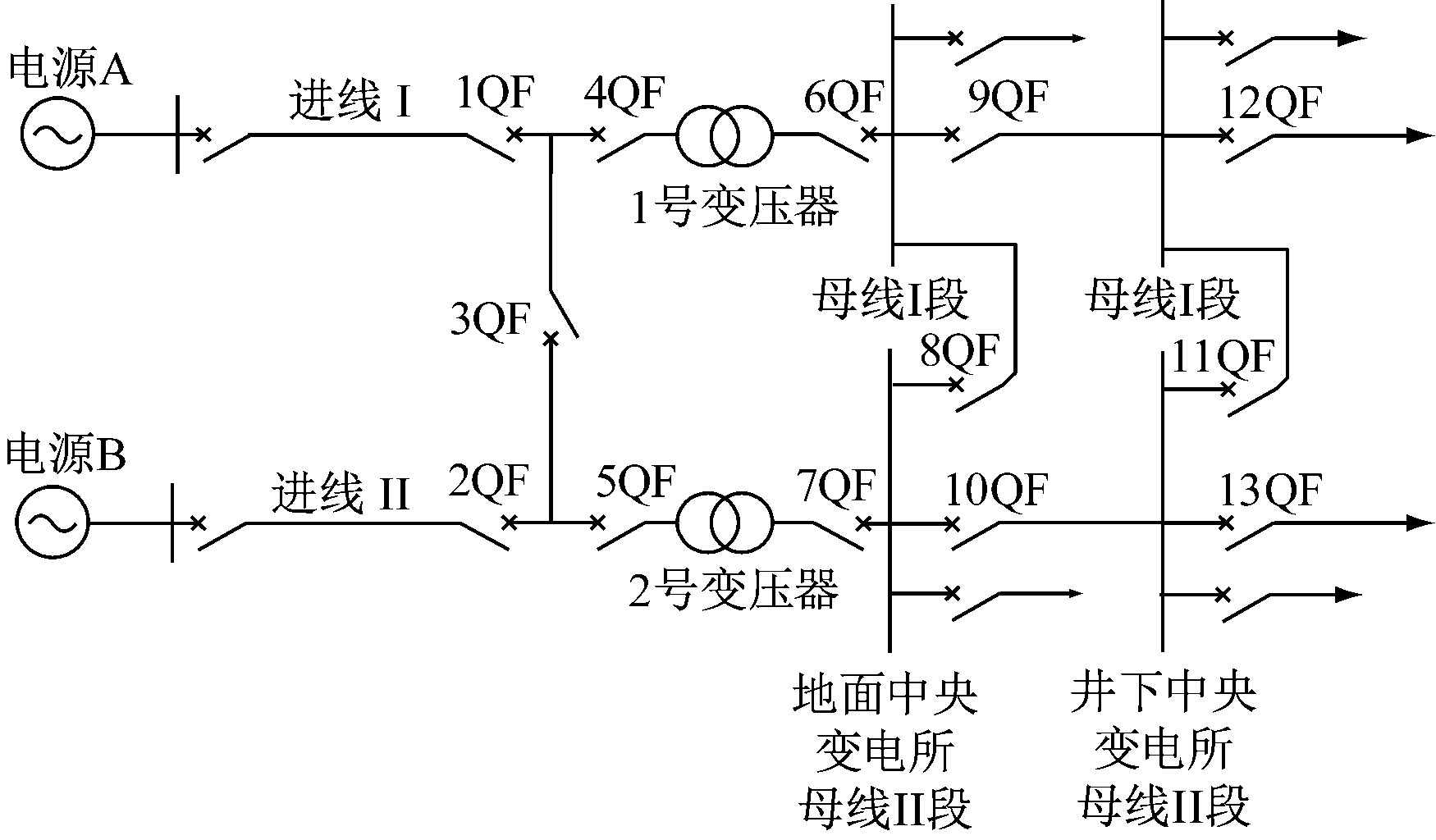 矿山供电系统主要由地面中央变电所、井下中央变电所和采区变电所组成,典型的矿山供电系统如图1所示[16-19]。矿山地面中央变电所主接线采用全桥接线,其中电源A和电源B取自上一级地区变电所,经过主变压器变电后输送给地面中央变电所。地面中央变电所采用单母线分段接线,通过两回路下井线路与井下中央变电所相连。