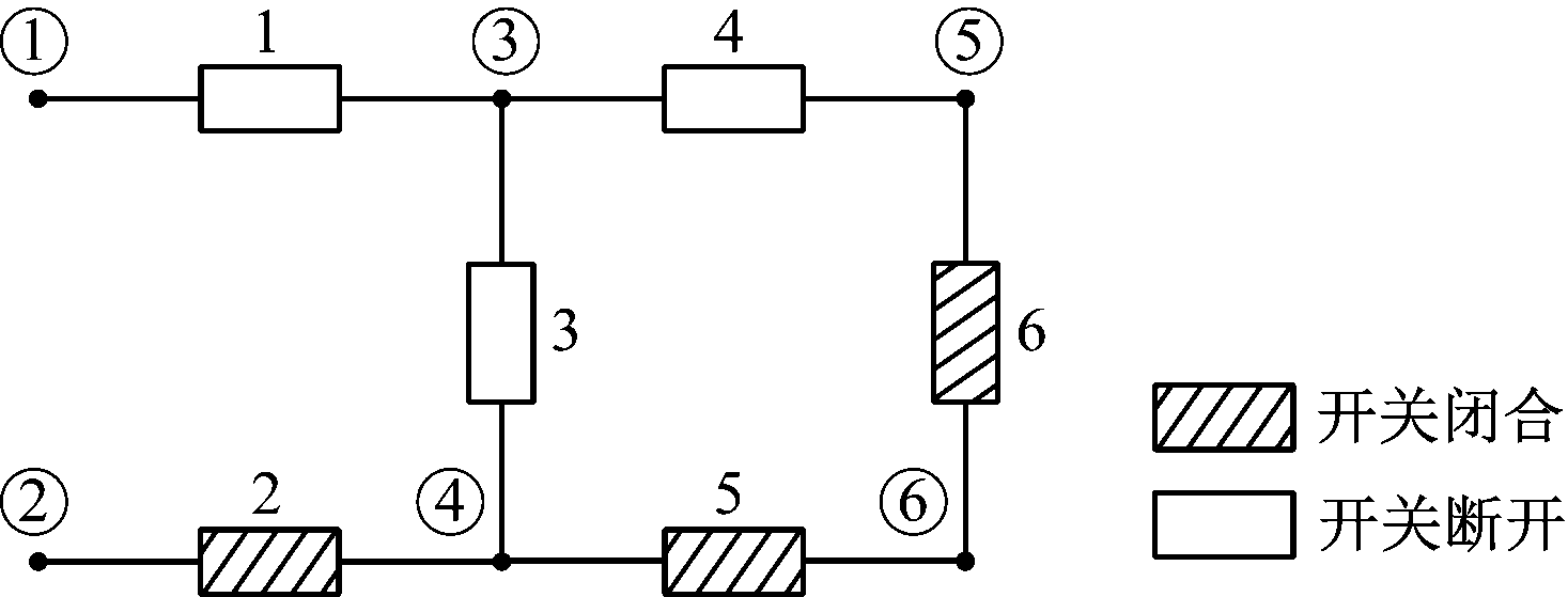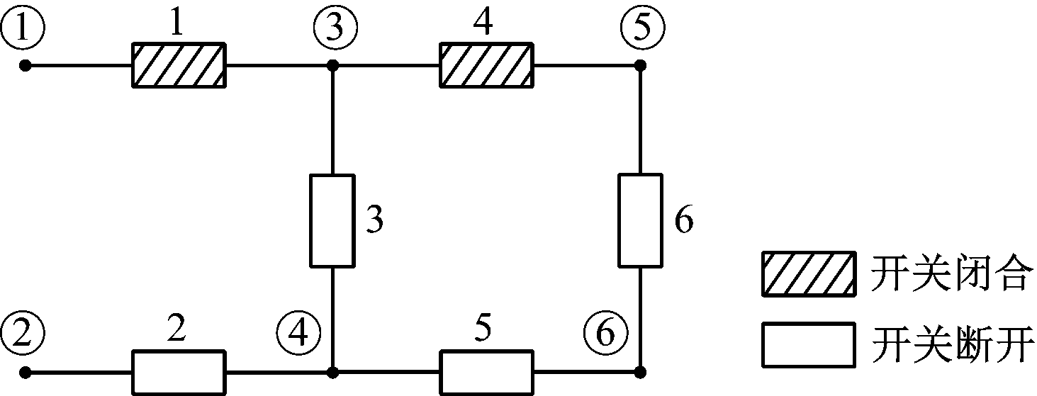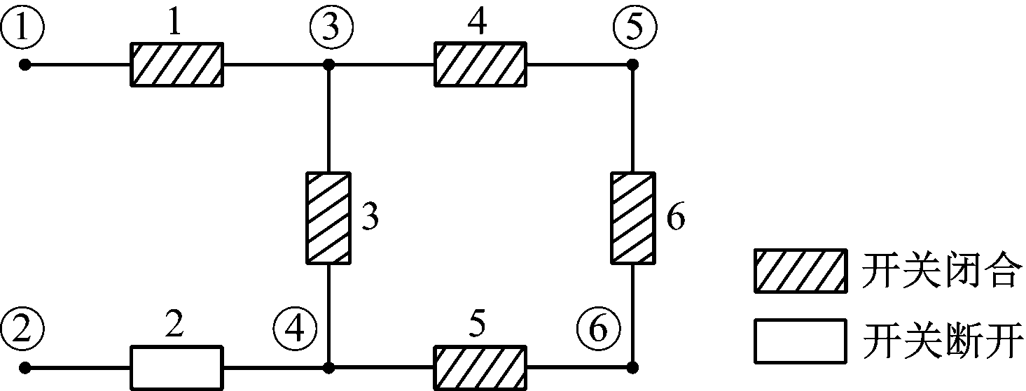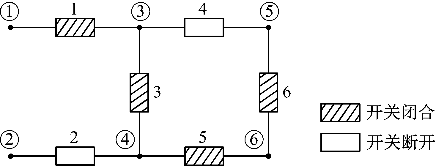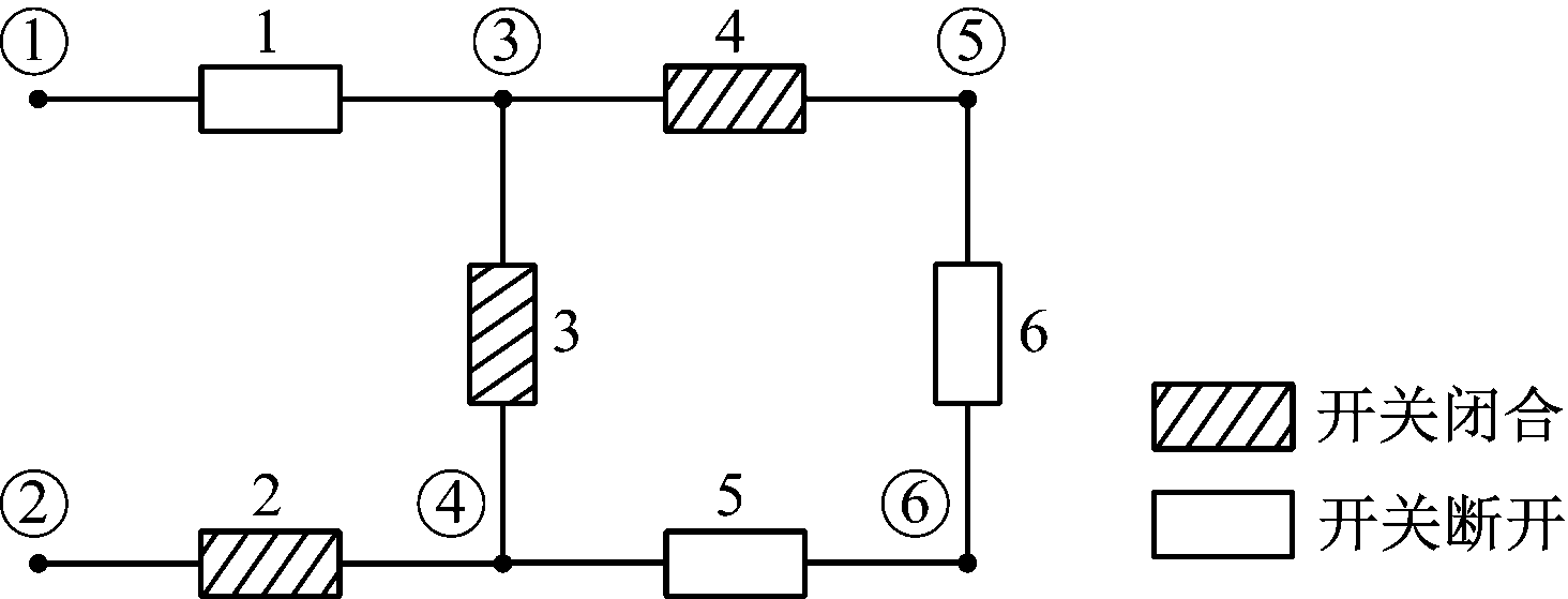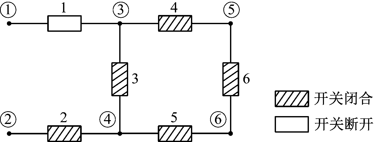 场景2:开关1、3、5、6闭合,开关2、4断开,如图2所示。式(7)即为场景2对应的开关状态信息矩阵。