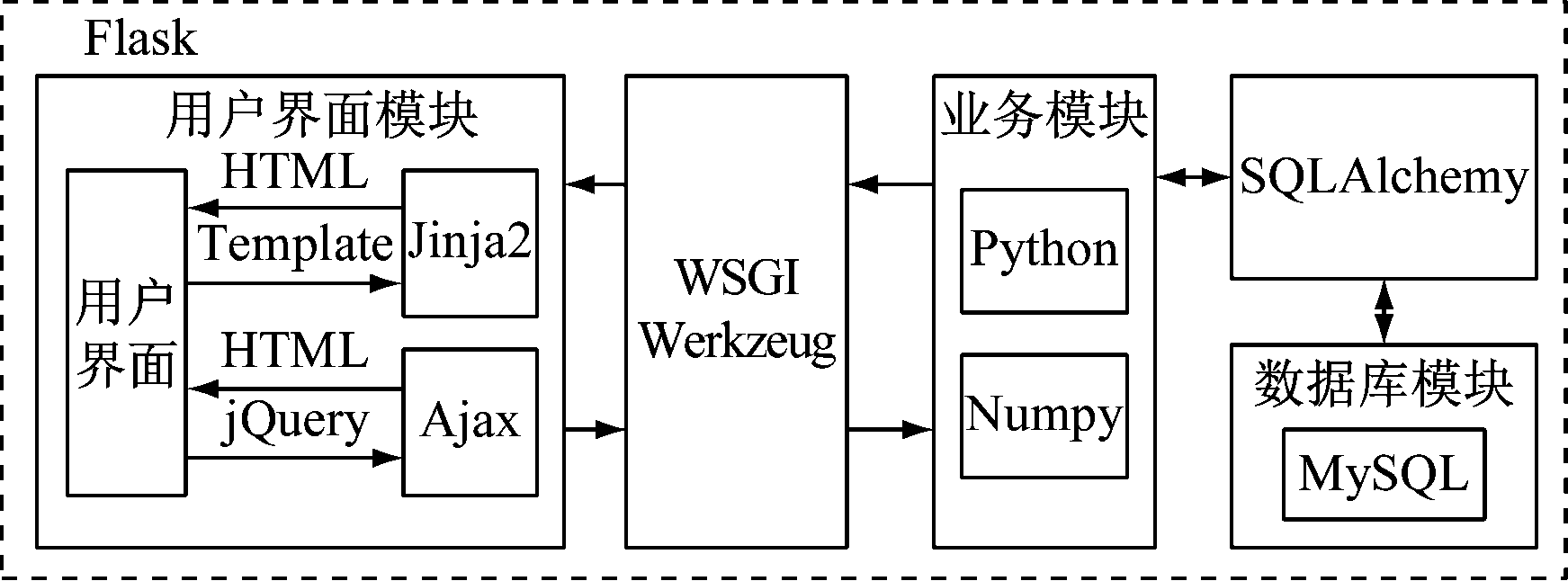 系统搭建采用Flask框架,Flask由Python编程语言开发,其WSGI工具箱采用Werkzeug,模板引擎则使用Jinja2。Flask是一个轻量级的可定制Web框架,用户可以根据自己的需求来添加相应的功能,在保持核心功能简单的同时实现功能的丰富和扩展,具有很强的扩展性和兼容性。Werkzeug是一个非常强大的WSGI,即Web服务器网关接口。系统通过Werkzeug接收用户界面的请求并将请求发送给业务模块,在业务模块进行逻辑运算后,返回给Werkzeug,并由Werkzeug发出响应并交还给用户界面。