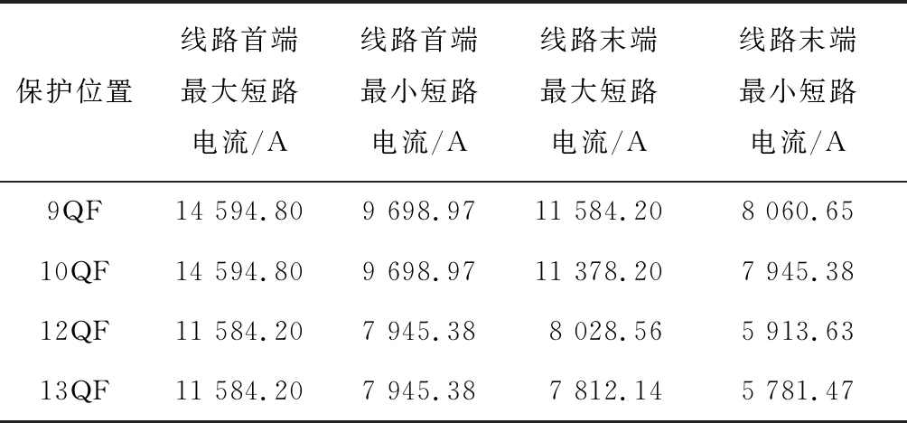 保护位置线路首端最大短路电流/A线路首端最小短路电流/A线路末端最大短路电流/A线路末端最小短路电流/A9QF14 594.809 698.9711 584.208 060.6510QF14 594.809 698.9711 378.207 945.3812QF11 584.207 945.388 028.565 913.6313QF11 584.207 945.387 812.145 781.47