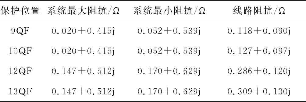 保护位置系统最大阻抗/Ω系统最小阻抗/Ω线路阻抗/Ω9QF0.020+0.415j0.052+0.539j0.118+0.090j10QF0.020+0.415j0.052+0.539j0.127+0.097j12QF0.147+0.512j0.170+0.629j0.286+0.120j13QF0.147+0.512j0.170+0.629j0.309+0.130j