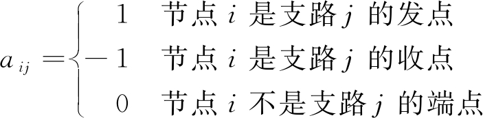 矿山供电网作为配电网,可将母线看作是节点,将线路以及变压器看作是支路,其拓扑结构可看作是一个有向图[20-21]。由此,可以定义矿山供电系统场景节点-支路关联矩阵A,假设有向连通图有N+1个节点和b条支路,对每条支路规定了正方向后,则其节点-支路关联矩阵A的阶次为b(N+1),A中的元素aij定义如下: