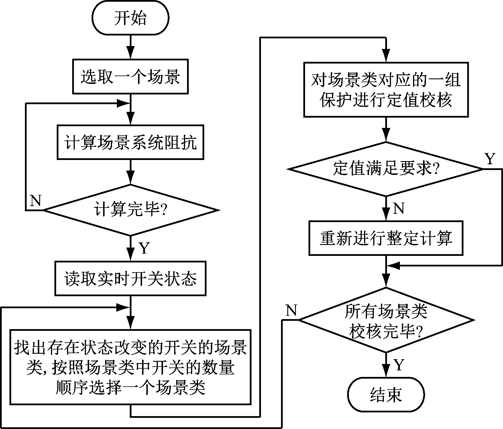 一组保护进行定值校核。根据定值校核计算结果,判断保护性能是否满足要求,若不满足要求,则对不满足要求的保护进行在线整定计算;若满足要求,则该场景类校核结束,重新选择下一场景类,直至全部场景类都校核完毕。