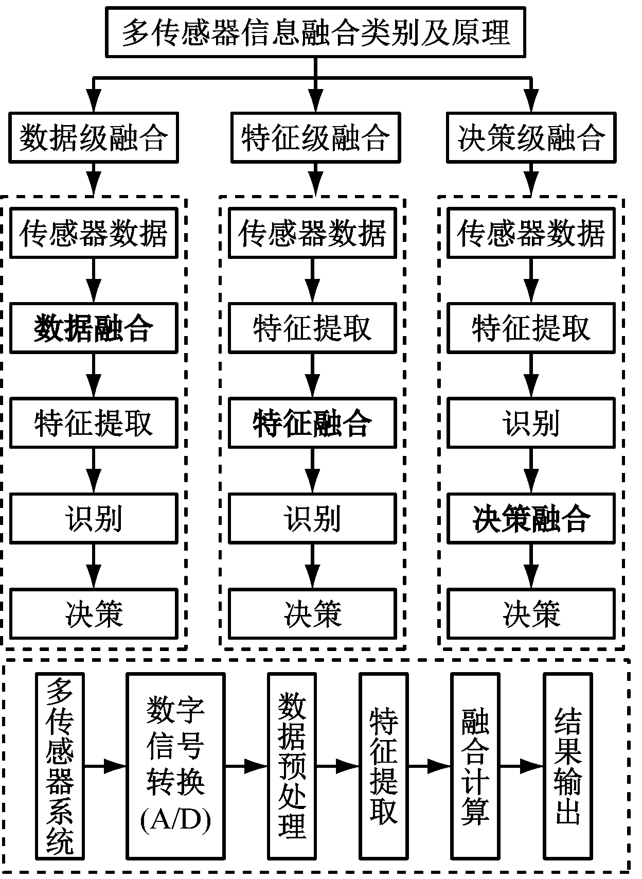 多传感器信息融合是将各传感器采集的信息以一定的准则进行分析与综合,进而实现决策和估计的信息处理过程。多传感器信息融合类别及原理如图4所示。