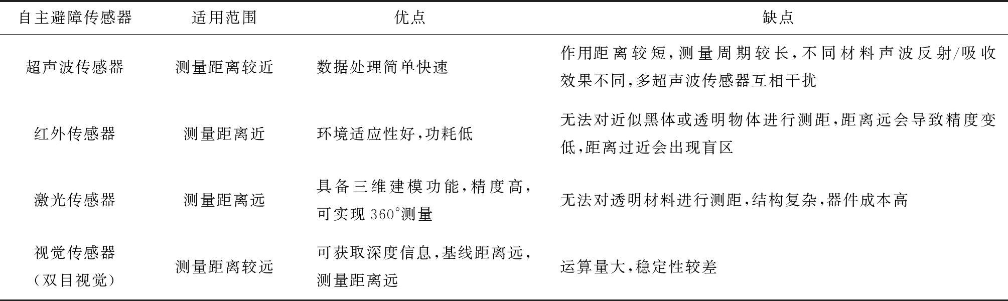 自主避障传感器适用范围 优点缺点超声波传感器测量距离较近数据处理简单快速作用距离较短,测量周期较长,不同材料声波反射/吸收效果不同,多超声波传感器互相干扰红外传感器测量距离近环境适应性好,功耗低无法对近似黑体或透明物体进行测距,距离远会导致精度变低,距离过近会出现盲区激光传感器测量距离远具备三维建模功能,精度高,可实现360°测量无法对透明材料进行测距,结构复杂,器件成本高视觉传感器(双目视觉)测量距离较远可获取深度信息,基线距离远,测量距离远运算量大,稳定性较差