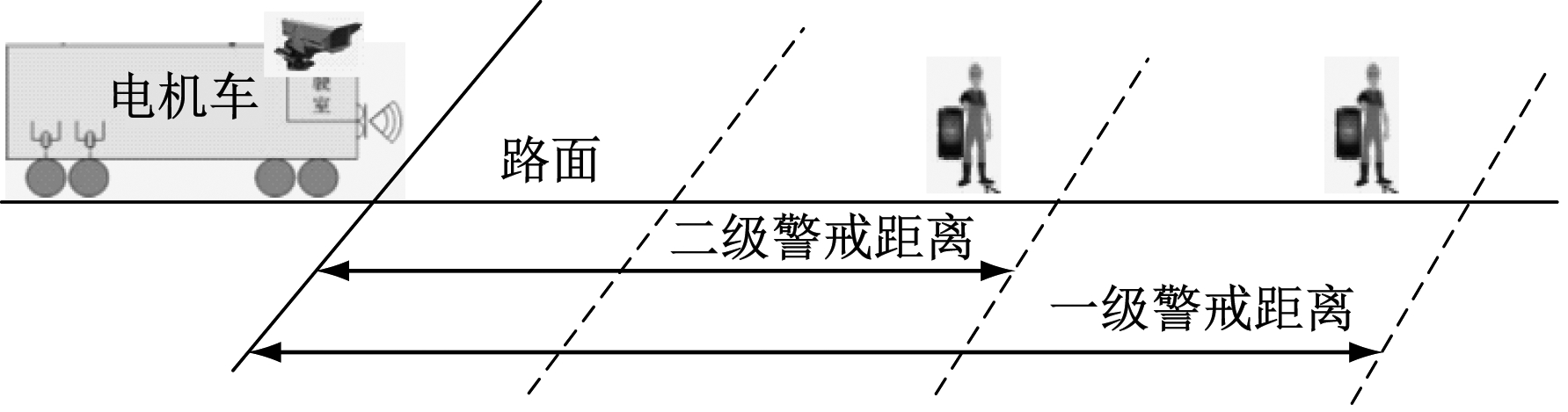 当改进的YOLOv3目标检测模型检测到车辆前方有人员出现时,依据多源信息感知模块获取的人员与车辆之间的距离,控制车辆速度。人员与车辆之间安全警戒距离如图8所示。若人员与车辆之间的距离在一级警戒距离范围内,边缘感知执行层发出声光报警提醒人员离开危险区域并降低车辆速度;若人员与车辆之间的距离处于二级警戒距离范围内,车辆将紧急制动,同时将此时的车辆位置信息上传至系统数据处理层的车辆调度服务器中进行分析处理,地面监控中心根据处理结果做出车辆调度决策,保证井下车辆有序运行与人员安全。