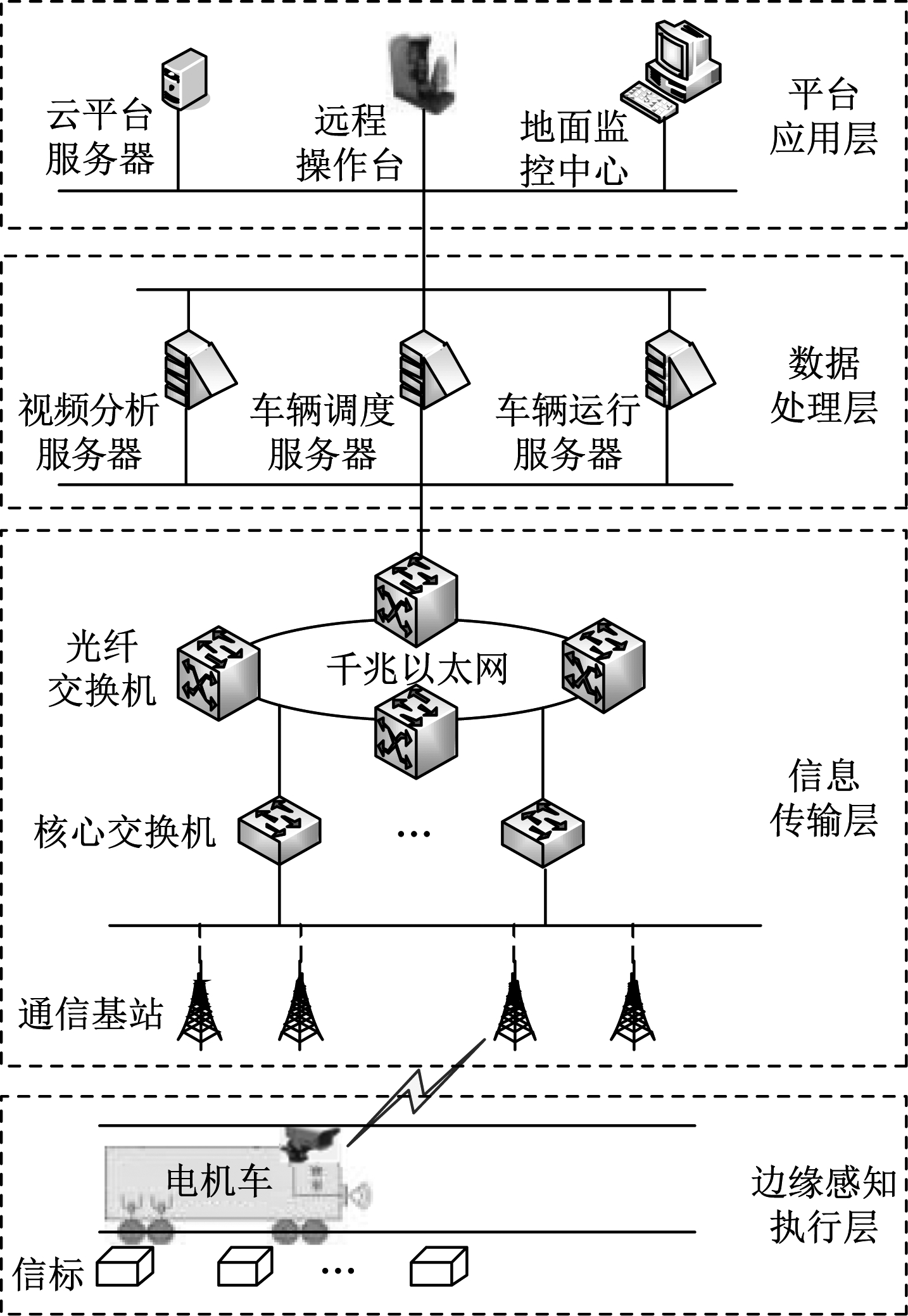 (3) 数据处理层。数据处理层通过视频分析服务器、车辆运行服务器和车辆调度服务器对边缘感知执行层中获取的多源感知信息、车载监控视频等进行分析处理。
