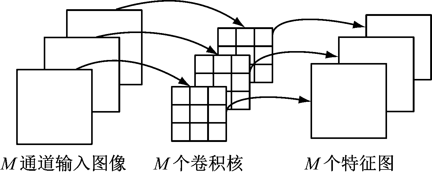 在逐通道卷积过程中,1个卷积核负责1个输入图像的通道,即1个通道只被1个卷积核卷积,通道数与所需的卷积核个数相等。对于1个M通道的输入图像,经过M个D×D维的卷积核运算后得到M个特征图。逐通道卷积特征提取运算所需参数个数为