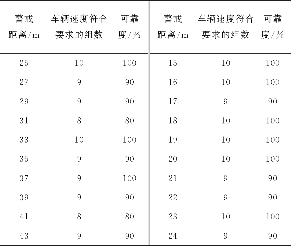 警戒距离/m车辆速度符合要求的组数可靠度/%警戒距离/m车辆速度符合要求的组数可靠度/%251010015101002799016101002999017990318801810100331010019101003599020101003791002199039990229904188023101004399024990