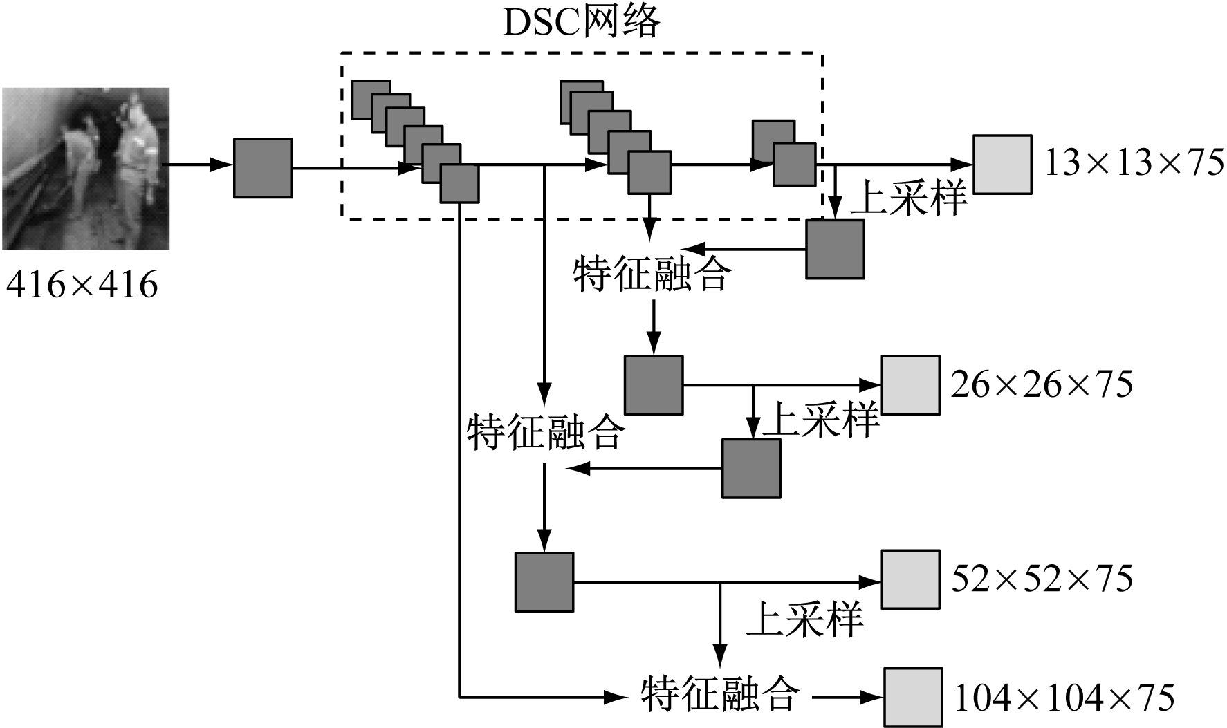 YOLOv3目标检测模型对输入图像进行特征提取使用的是由1个常规卷积层和5个尺度不同的残差单元组成的DarkNet-53特征提取网络。其中,残差结构在网络加深时使用“短路连接”方式将之前的特征添加到后面的特征图中得到物体的更多特征,通过上采样与特征金字塔网络(Feature Pyramid Network,FPN)得到不同尺度的特征图,最后使用回归函数对目标分类[10-12]。虽然YOLOv3目标检测模型在图像特征提取中采用残差结构加快了网络训练速度,但随着网络深度加大,整个模型特征提取运算参数增大,不利于井下人员检测的实时性。因此,本文使用DSC网络代替YOLOv3目标检测模型中的DarkNet-53特征提取网络,根据上采样与FPN的思想,扩大特征图尺度,用于对远方模糊、尺度变化的人员检测。