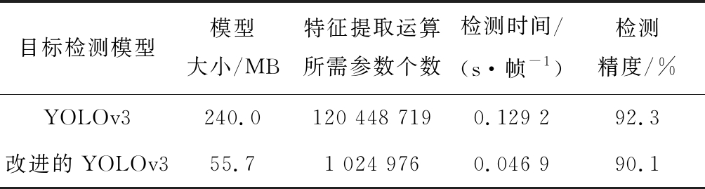 目标检测模型模型大小/MB特征提取运算所需参数个数检测时间/(s·帧-1)检测精度/%YOLOv3240.0120 448 7190.129 292.3改进的YOLOv355.71 024 9760.046 990.1