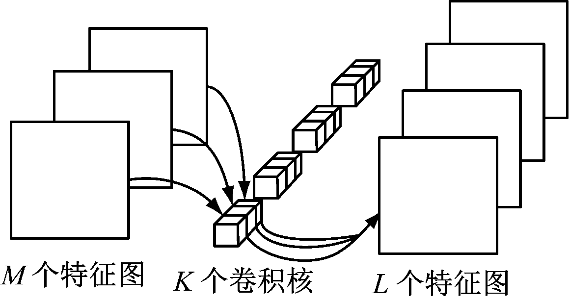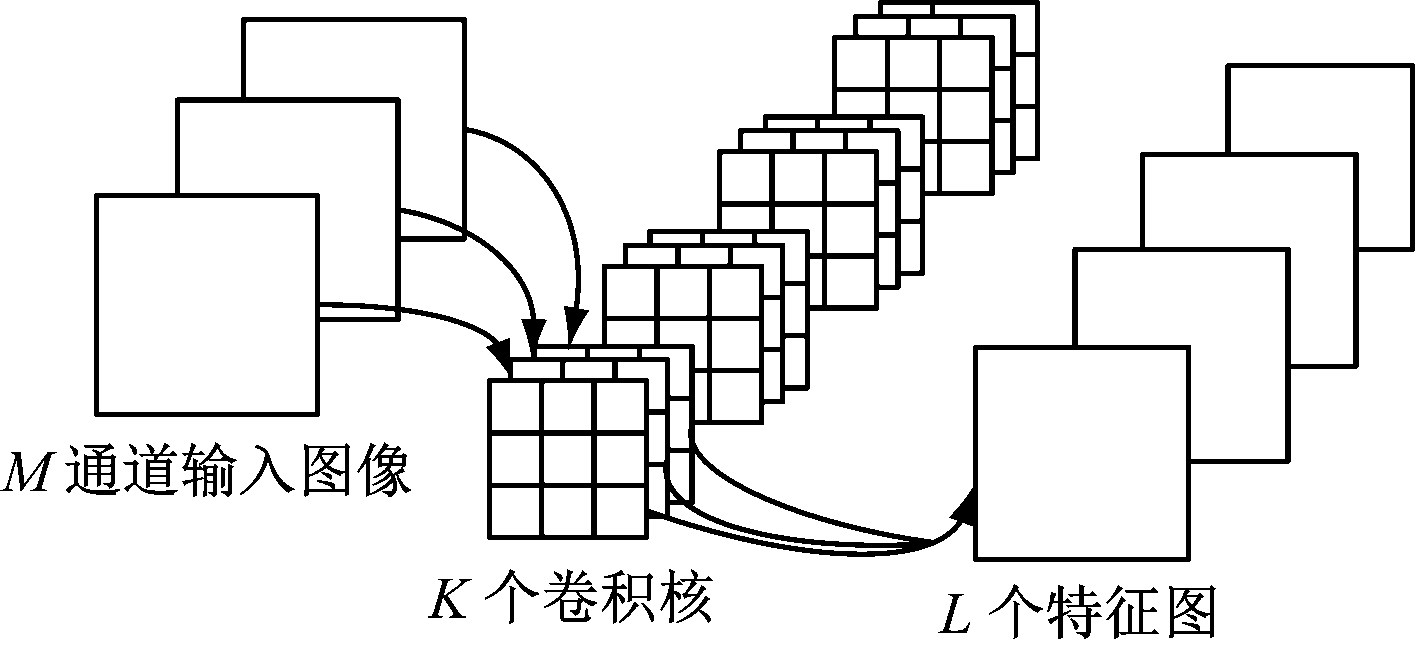 YOLOv3目标检测模型的DarkNet-53特征提取网络使用K个D×D维的卷积核对M通道的输入图像特征融合,得到L个特征图,如图6所示。