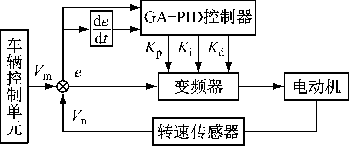 基于GA-PID的车辆速度控制原理如图7所示。通过转速传感器实时测量车辆速度Vn并与给定速度Vm比较得到速度偏差e,GA-PID控制器根据速度偏差e和车辆减速时的加速度de/dt,寻找最优PID控制参数Kp,Ki,Kd(Kp,Ki,Kd分别为比例、积分、微分调节系数),控制变频器输出不同占空比的PWM信号来调节电动机转速,形成车辆速度的闭环控制。