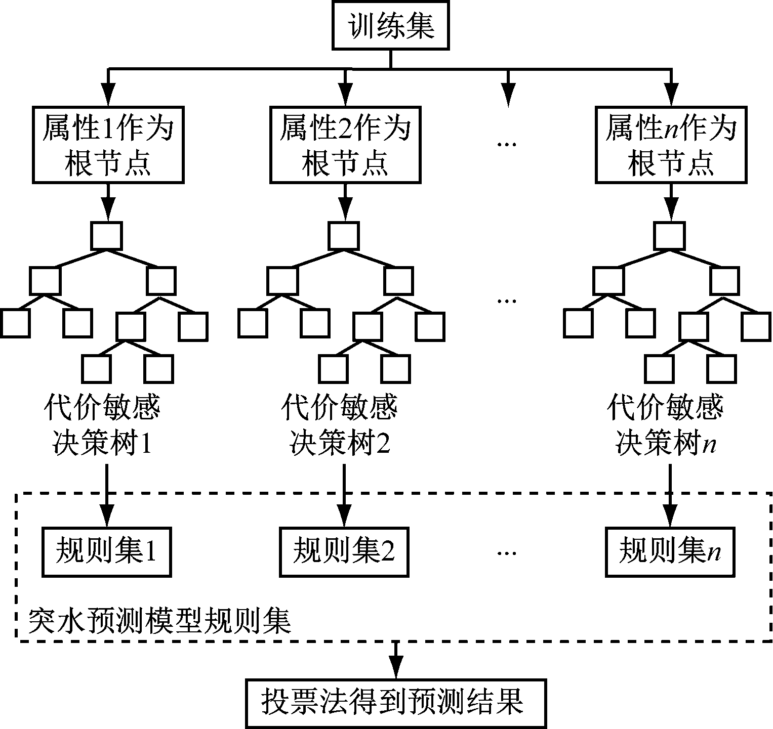 基于不同根节点信息的代价敏感多决策树煤层底板突水预测模型构建流程如图1所示。其中的训练集为采集的煤层水文地质数据,代价敏感决策树1,2,…,n分别采用煤层水文地质数据各突水影响因素作为其根节点属性,基于代价敏感单决策树突水预测模型构建流程得到单个突水预测模型,单个模型构建完成后,可以得到n个单决策树的规则集,这些规则集合并可得到最终突水预测规则集,最后采用投票法得到最终的预测结果。