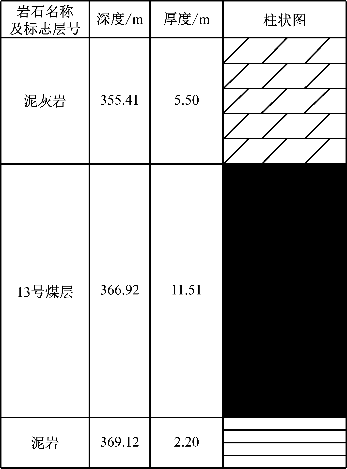 根据该煤矿某采煤工作面的现场实际观测,本文采集多种与煤层底板突水相关的数据,经过筛选整理、反复分析,最终确定影响研究工作面的煤层底板突水因素主要有奥陶岩溶水含水层厚度、煤层底板有效隔水层厚度、隔水层承受水压和埋深。由专家对确定的煤层底板突水数据进行分析并进行突水安全状态标记,获得带标签的有效数据共计95组, 13号煤层部分有效数据见表1,其中,突水状态中的“0”表示安全,“1”表示突水。由于突水情况对应的实际生产数据较难得到,经过与突水专家讨论分析,在实际数据基础上,经过理论分析得到一部分反映突水状况的理论分析数据,用于本文的仿真实验,目的是验证模型的有效性。其中安全状态时对应的一组数据的钻孔柱状图如图3所示,其孔口标高为1 064.35 m。