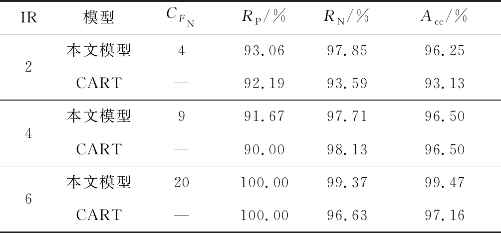 (2) 在数据不平衡率IR从2逐渐增加时,比较基于Gini指标的CART单决策树模型预测性能与基于本文模型的预测性能,以说明本文所构建的突水预测模型的有效性。