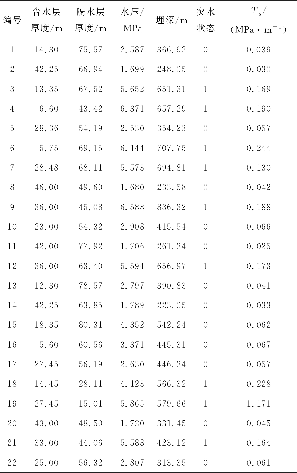 编号含水层厚度/m隔水层厚度/m水压/MPa埋深/m突水状态Ts/(MPa·m-1)114.3075.572.587 366.9200.039242.2566.941.699248.0500.030313.3567.525.652651.3110.16946.6043.426.371657.2910.190528.3654.192.530354.2300.05765.7569.156.144707.7510.244728.4868.115.573694.8110.130 846.0049.601.680233.5800.042 936.0045.086.588836.3210.188 1023.0054.322.908415.5400.066 1142.0077.921.706261.3400.025 1236.0063.405.594656.9710.173 1312.3078.572.797390.8300.041 1442.2563.851.789223.0500.033 1518.3580.314.352542.2400.062 165.6060.563.371445.3100.067 1727.4556.192.630446.3400.057 1814.4528.114.123566.3210.228 1927.4515.015.865579.6611.171 2043.0048.501.720331.4500.045 2133.0044.065.588423.1210.164 2225.0056.322.807313.3500.061