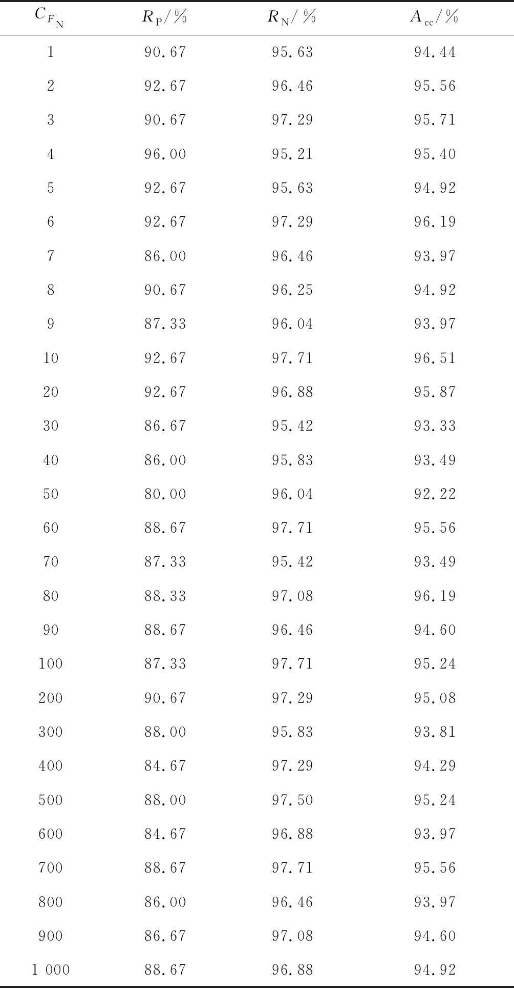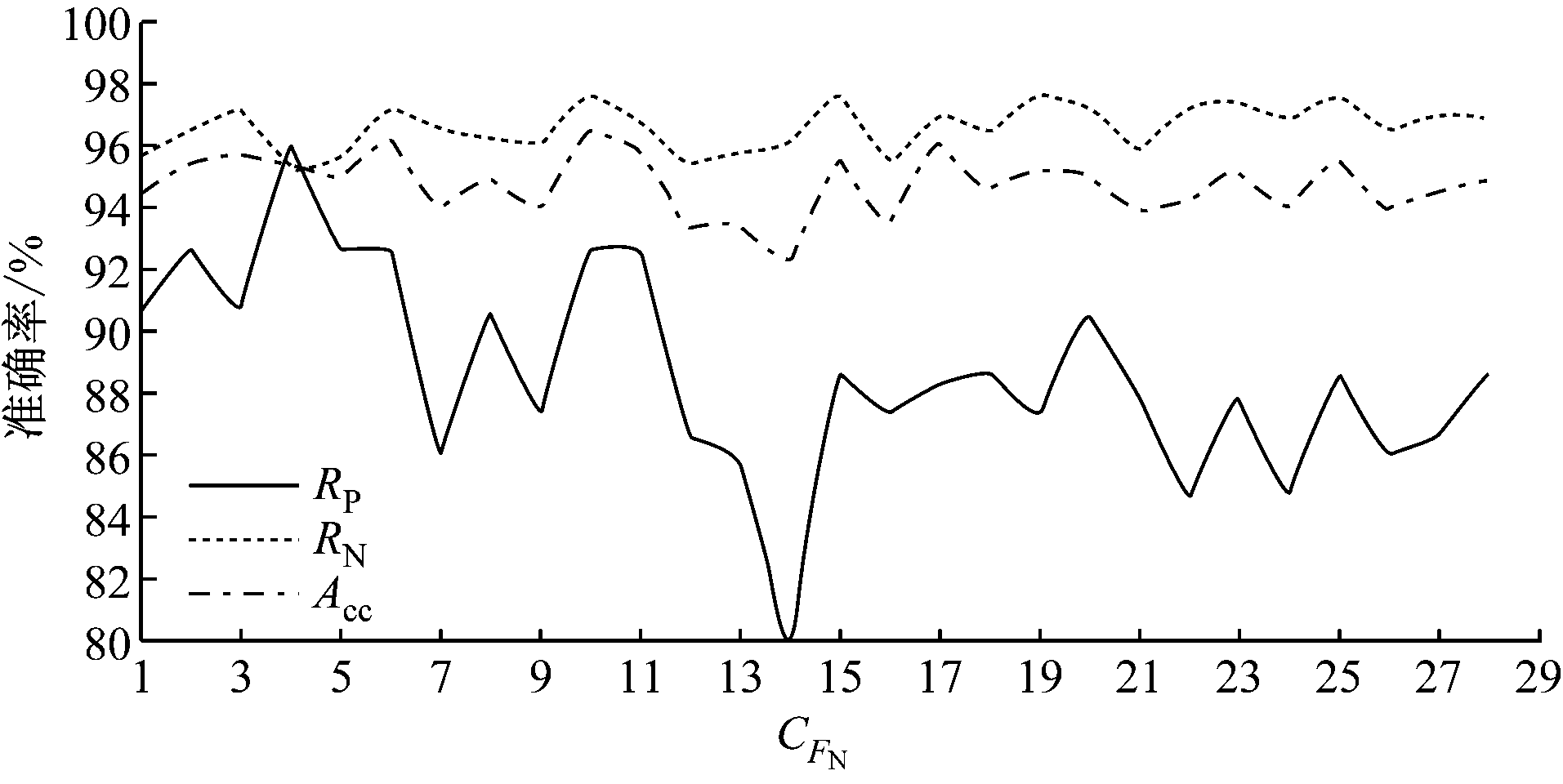 图4给出了表2预测性能变化趋势对比。由图4可看出,CFN从1按照步距1增长至10时,RP一直保持较高的预测准确率,其中CFN为4时达到了最大值96.00%。当CFN大于10之后,RP总体呈现下降趋势,RN变化不显著,Acc由于RP的变化也呈现逐渐减小趋势。这表明代价敏感因子CFN取值也不能太大,否则补偿过度,反而导致预测性能下降。为此,在数据不平衡率IR为2.8时,本文最终选取CFN=10,以使3个指标都能达到较满意结果。此时正类率RP为92.67%,负类率RN为97.71%,总体预测准确率为96.51%。