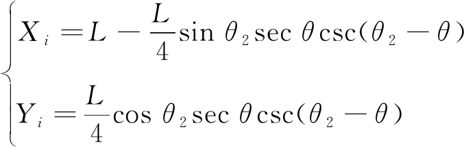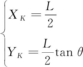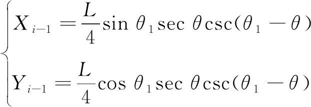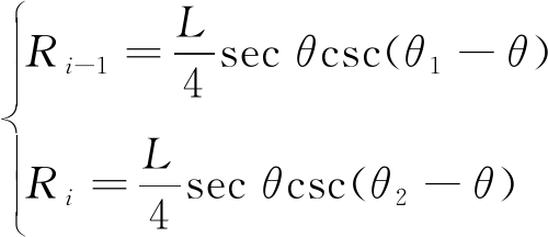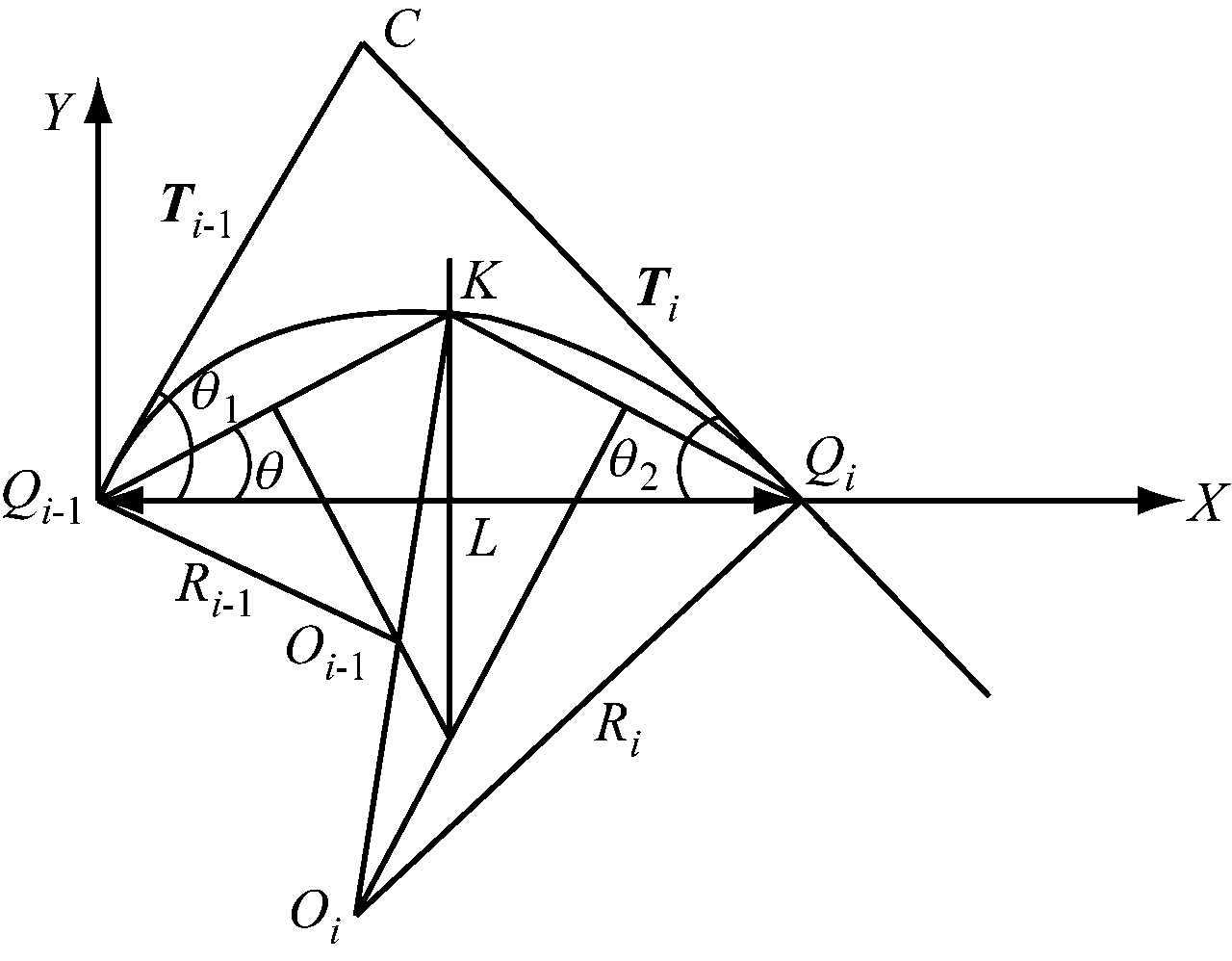 Qi-1,Qi两点连线为坐标系X轴,Qi-1为原点,过原点作与Qi-1,Qi两点连线垂直的线设为Y轴,当选择不同的公切点K时,半径、圆心坐标有不同的计算公式和计算结果,本文为了简化计算,K点设置在Qi-1,Qi两点的中垂线与圆弧的交点处,其中Qi-1,Qi两点连线之间距离为L,等腰三角形ΔQi-1KQi中,两侧角度都为θ,Ti-1与X轴夹角为θ1,Ti与X轴夹角为θ2,其半径Ri-1,Ri及公切点K,圆心Oi-1,Oi的坐标表达式如下。