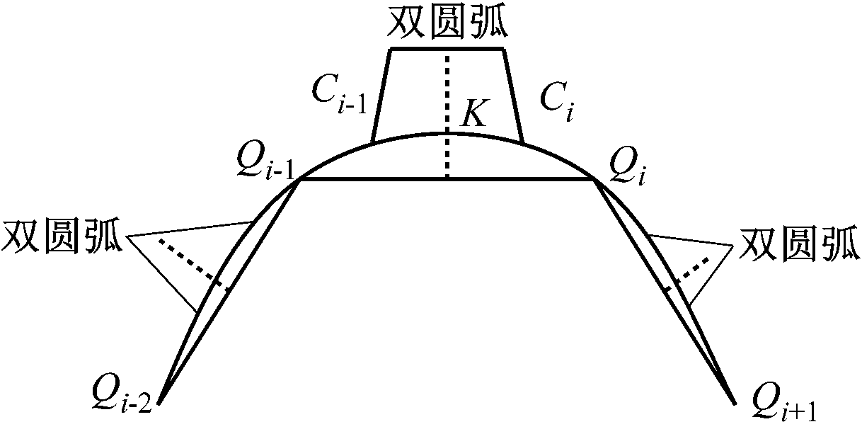 圆弧样条曲线拟合基本思想[10]是将相邻两点之间用两段相切的圆弧进行拟合,其本质是一阶导数连续函数。当有n个控制点时,整条曲线是由2(n-1)段圆弧组成的,其绘制方法为通过CAD中spline命令将控制点连接起来,继而通过splinedit命令完成曲线拟合,系统将在端点处计算默认为切向。此处以顶板控制点Qi-2,Qi-1,Qi,Qi+1为例绘得图4,可以发现该线由6段圆弧组成。以Qi-1,Qi两点为例对双圆弧定义进行阐述:Ci-1圆弧以Qi-1为起点,且在Qi-1点存在一切向量Ti-1;Ci圆弧以Qi为终点,在Qi点有一切向量Ti;Ci-1段圆弧与Ci段圆弧之间存在一条公共切线,切点为K,K点是Ci-1和Ci的连接点(Ci-1≠Ci),是Ci-1的终点,也是Ci的起点。
