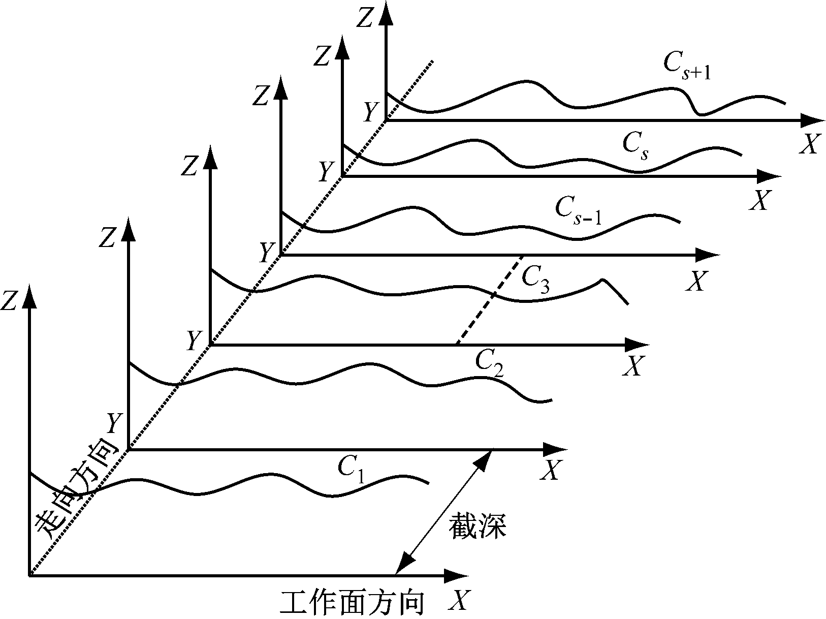上滚筒生成连续割煤路径的基本思想为将煤层模型进行切片,厚度设置为截深,分别得到切片Sh(h=1,2,…,m,m为切片),每一切片可生成顶板控制点数据,随后利用双圆弧拟合逼近得到割煤路径Cs(s=1,2,…,g,g为割煤路经曲线),如图7所示。