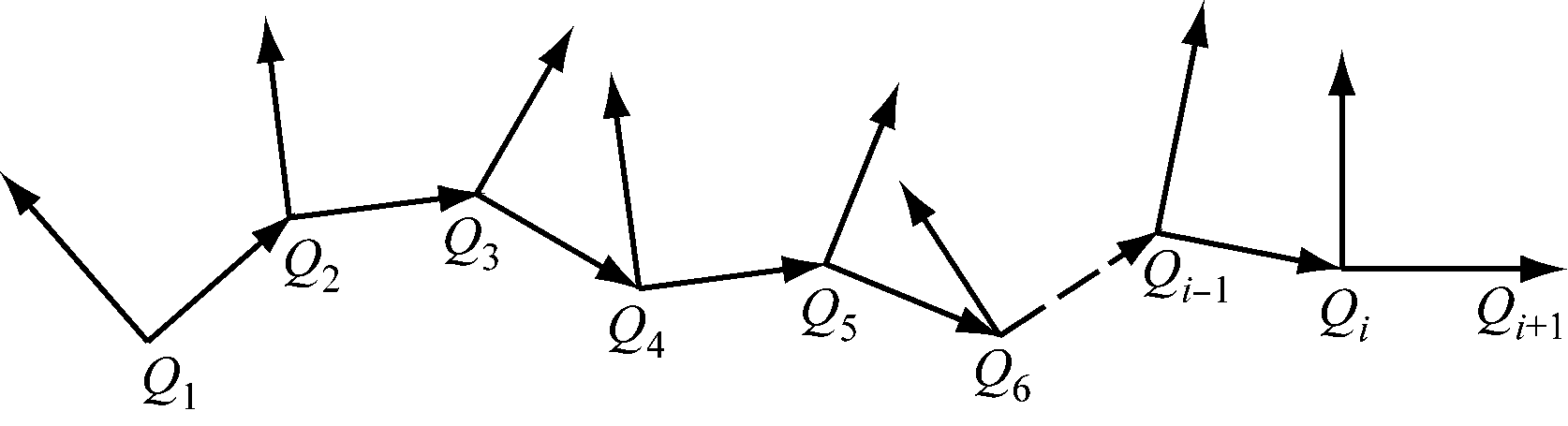 通过对双圆弧曲线中单个坐标系进行分析可以得出相邻控制点之间的坐标关系,对于整个顶板控制点集合,要得出相互坐标关系必须建立连续坐标系,如图6所示。