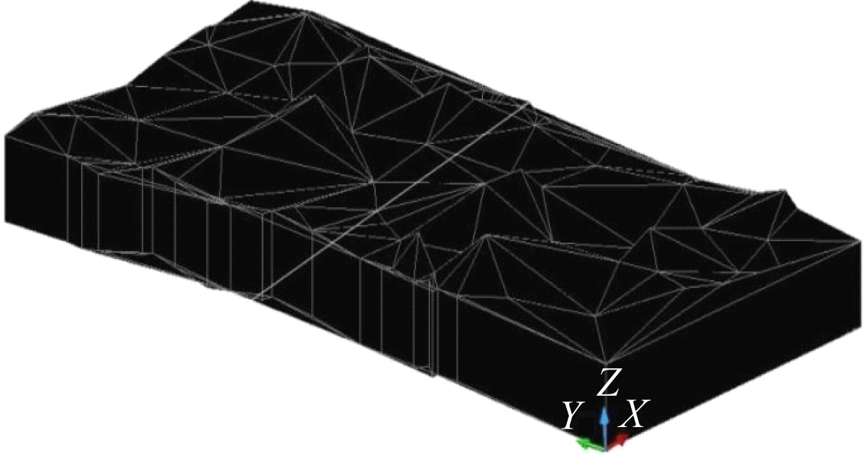 模型数据来源为山西某矿的一个自动化工作面的实际钻孔数据和经克里金插值法生成的虚拟钻孔数据,根据现场数据和虚拟插值建立的工作面模型能够较好地体现井下环境的变化。通过建立平面隐函数方程,切割煤层上表面获得采煤工作面上表面模型;根据GTP体元建模原理,煤层上表面三角单元沿对应钻孔轨迹向下扩展形成煤层下表面,得到采煤工作面DTIN三维模型,如图1所示。