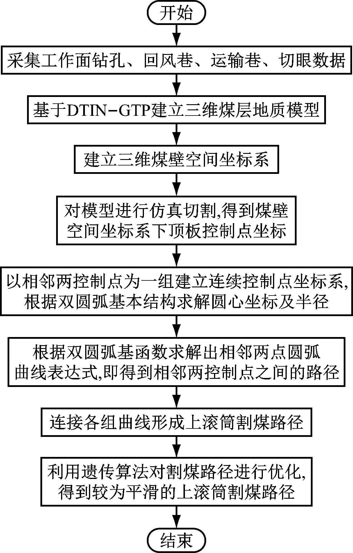 针对采煤机上滚筒在割煤过程中常发生切割顶板的现象,本文提出了一种基于双圆弧样条曲线的采煤机上滚筒割煤路径规划方法。首先采集工作面钻孔、回风巷、运输巷及切眼等的数据进行三维煤层地质模型的建立;然后根据煤壁空间坐标系对模型进行仿真切割,得到顶板控制点集合,以相邻两点为一组建立连续控制点坐标系,根据双圆弧基本结构求解圆弧半径及圆心坐标,根据双圆弧基函数可以得到相邻两控制点之间的路径,即上滚筒割煤路径;最后采用遗传算法,经过选择、交叉、变异操作对割煤路径进行仿真优化,得到了更为合理、精确度更高的割煤路径。其基本流程如图3所示。