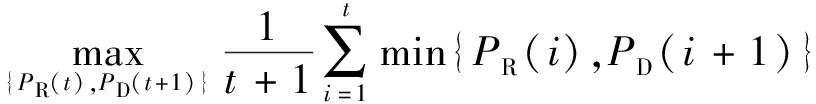 设在第t个时隙中,中继的发送功率为PR(t),则在中继可靠解码该消息时有PR(t)≤P,同样,目的节点功率PD(t+1)必须满足PD(t+1)≤PR(t+1),可得中继网络的最低功率为