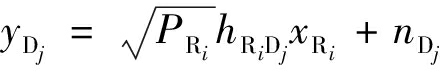 相比于数据传输的能耗,源和中继的电路能耗等能耗非常小,因此可以忽略不计,故假设中继节点收集的能量用于信号处理,则目的节点Dj接收的来自中继节点Ri的信号为