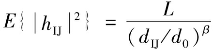 为节点I到节点J的信道增益;L为参考距离d0处的路径损耗;dIJ为节点I和节点J之间的距离;β为损耗指数。