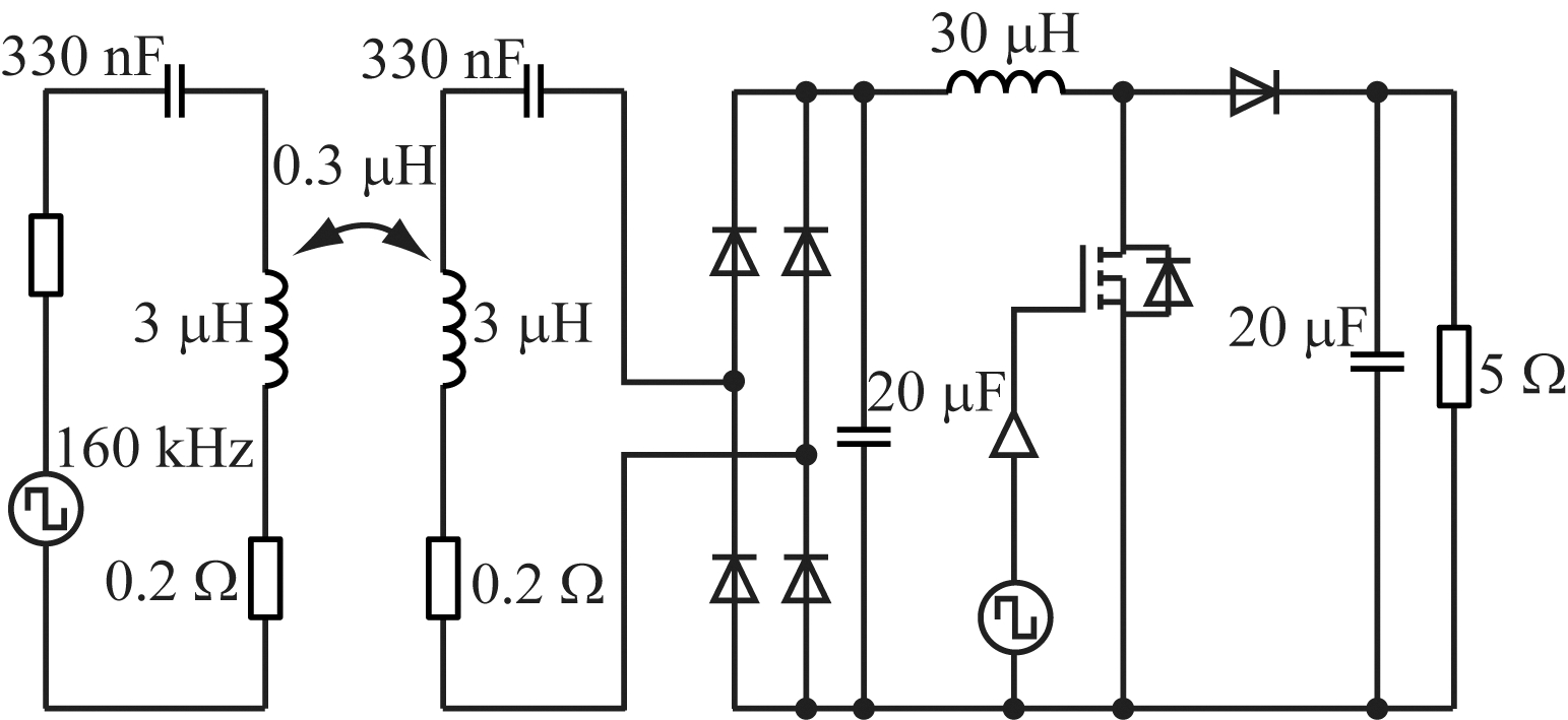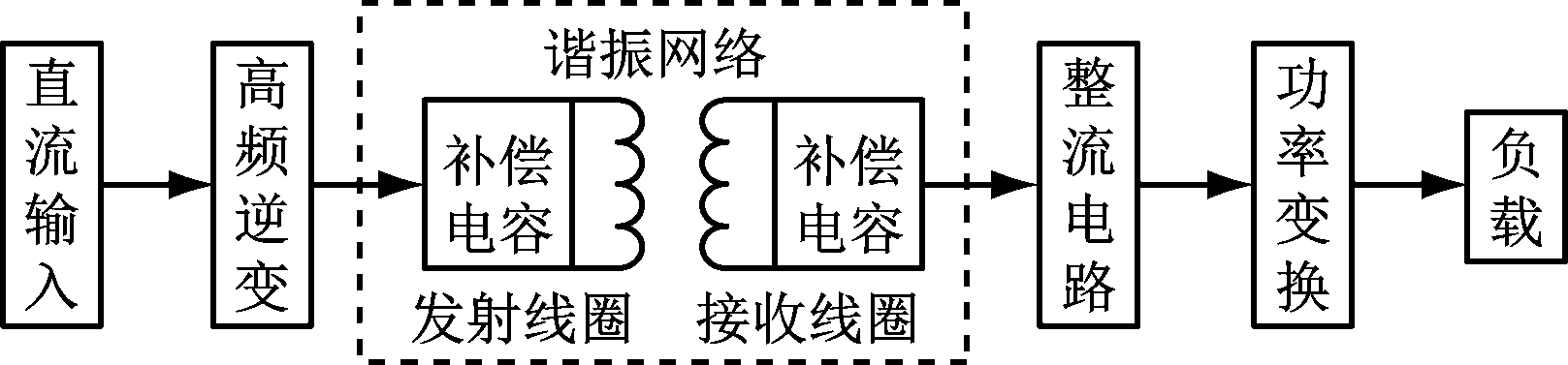 直流输入首先通过高频逆变单元逆变为高频交流电压,然后通过高频谐振网络(由接收/发射线圈和补偿电容组成)产生高频交变电磁场,实现电磁能量的非接触式传输,最后通过整流电路对接收线圈接收到的交流电能进行整流变换,以对直流负载供电。
