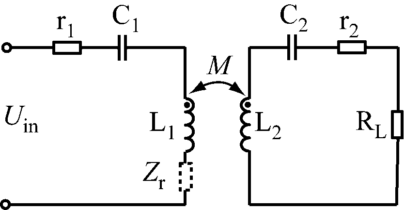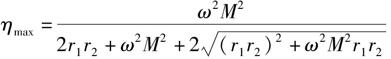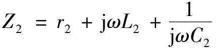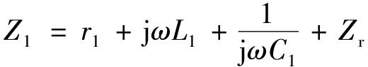 图3中,L1和r1分别为初级线圈的自感和寄生电阻,L2和r2分别为次级线圈的自感和寄生电阻,2个线圈需各自外接串联谐振电容C1与C2,M为两线圈之间的互感。Uin为开关频率为f的交流电源电压有效值,对应角频率ω=2πf。RL为负载阻值,为方便分析,认为其为纯阻性负载。MR-WPT系统的输入阻抗Z1、接收线圈的阻抗Z2、接收线圈映射到发射线圈的反映阻抗Zr的表达式如下: