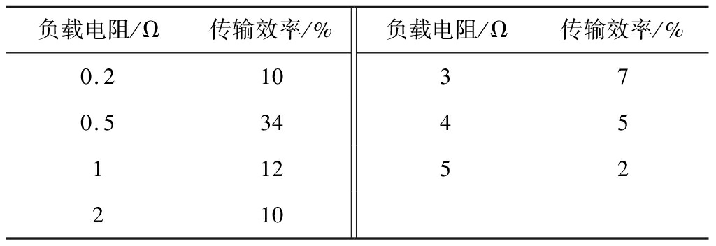 对MR-WPT系统进行了2组实验,首先进行了开环实验,通过手动调节负载电阻值,测试MR-WPT系统传输效率,结果见表2。由表2可知,当负载由0.2 Ω增大到5 Ω时,传输效率先增加,后减小,传输效率最高点在负载为0.5 Ω时,此时传输效率为34%。当负载为5 Ω时传输效率只有2%。由此可见,存在一个最佳电阻值,使得MR-WPT系统传输效率最高。