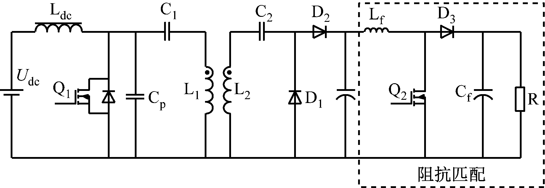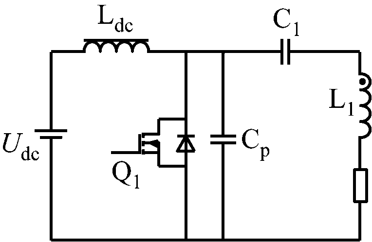 图2中,Udc为直流电源,Ldc为扼流线圈,Udc和Ldc组成输入的电流源。L1和C1组成串联谐振电路,Cp为开关管并联电容。当开关频率为串联谐振频率且并联电容参数设置合理时,E类功率放大器的串联电感的电流为正弦波。因此,E类功率放大器可以用于MR-WPT系统的功率发射源。