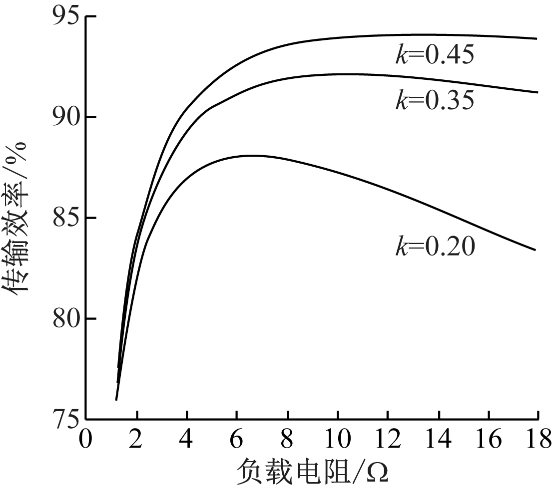 根据式(7)和式(8)可得到在不同耦合系数情况下负载电阻与传输效率的关系曲线,如图4所示。