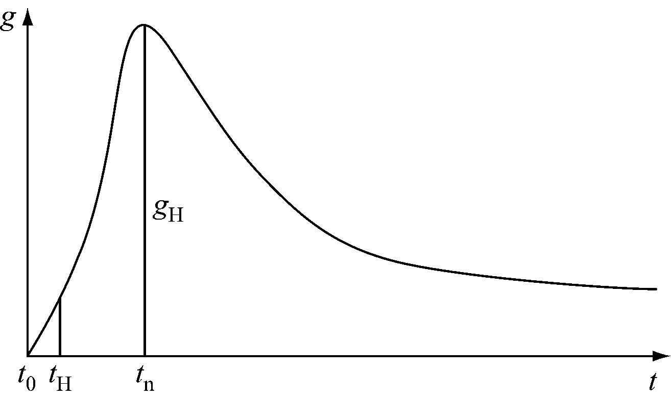 文献[13]给出了单位时间内钻孔内涌出瓦斯量g与时间t之间的关系曲线,如图5所示,其中,t0为打钻施工结束时间,tH为施钻封孔后开始测量钻孔瓦斯涌出初速度的时间,tn为瓦斯涌出量达到最大值的时间。定义单位时间内向测量室涌入的最大瓦斯量为钻孔瓦斯涌出初速度gH,通过对全国各大矿区实验室跟踪考察得出,不同煤与瓦斯突出煤层的钻孔瓦斯涌出初速度gH临界值能够较好地反映工作面前方煤与瓦斯突出危险性。