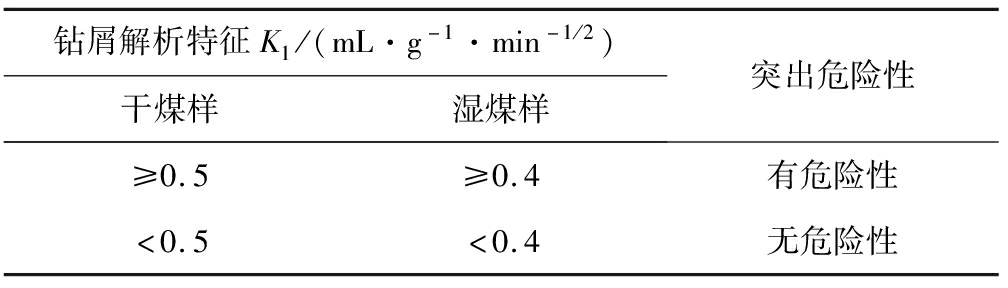 根据测试及统计结果,全国各主要生产矿区钻屑解析特征K1临界指标具有较大差异,应根据试验结果确定具体临界值或按《防治煤与瓦斯突出细则》要求(表1)执行。