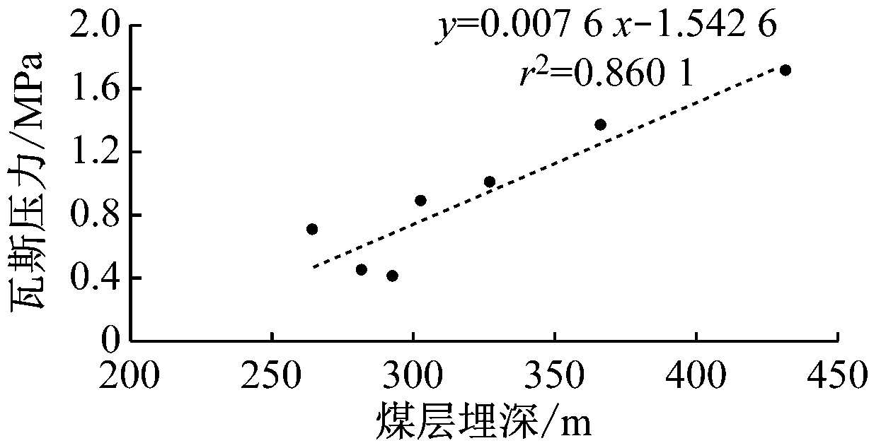 以山西古交矿区屯兰井田太原组8号主采煤层为研究对象,分别选取7组煤样研究瓦斯赋存与煤层埋深之间的关系,结果如图2所示,其中r为相关性系数。分析可知,当煤层瓦斯压力为0.74 MPa时,对应煤层埋深为291.7~315.4 m。因此,当工作面生产埋深为290 m以上时,应加大煤与瓦斯突出(瓦斯喷出)灾害的预防力度,防止事故发生。